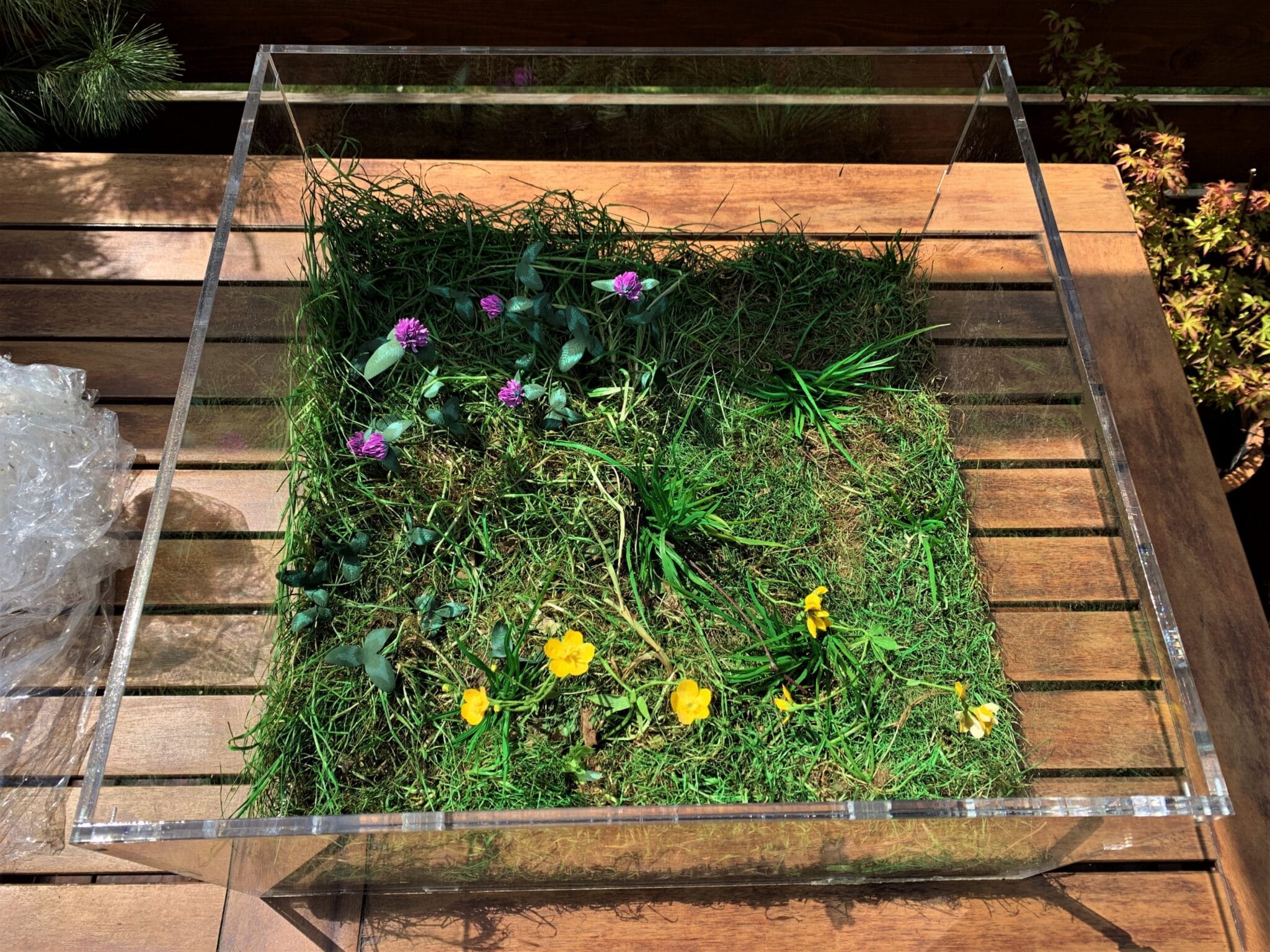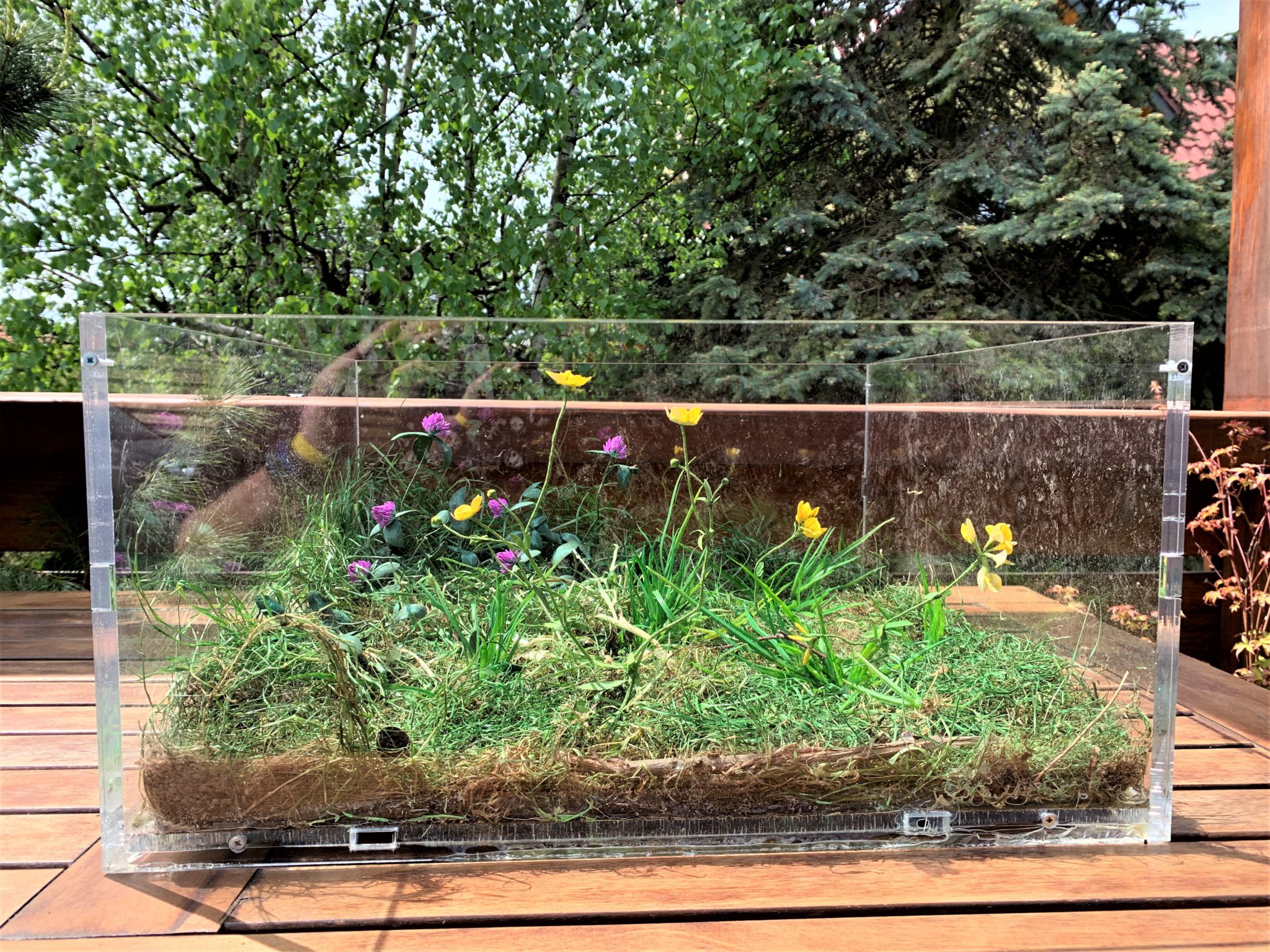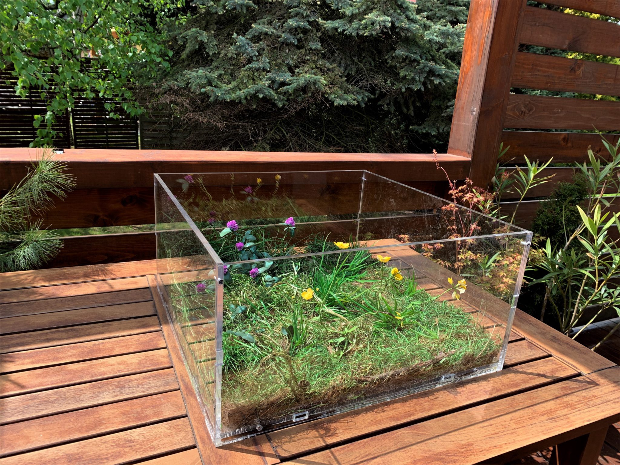 Wykonaliśmy mini dioramę dla potrzeb przetargowych – fragment ukwieconej łąki w odpowiednio dobranym ekspozytorze.